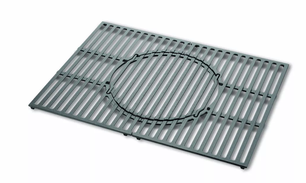 Todelt støpejernsrist med uttagbar midtseksjon, for bruk av Gourmet BBQ System-innsatser. Passer til Spirit 300-serien.